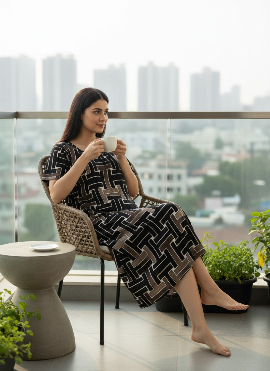 This nightdress offers soft, dreamy comfort perfect for relaxing or sleeping in all seasons. Featuring a loose fit silhouette, half sleeves, a round neckline, and pullover closure, it showcases an abstract pattern that enhances its casual charm. Crafted from viscose, it is breathable, lightweight, stretchable, and suitable for all seasons. Easy to care for with machine wash cold instructions, it is ideal for lounging and everyday comfort.