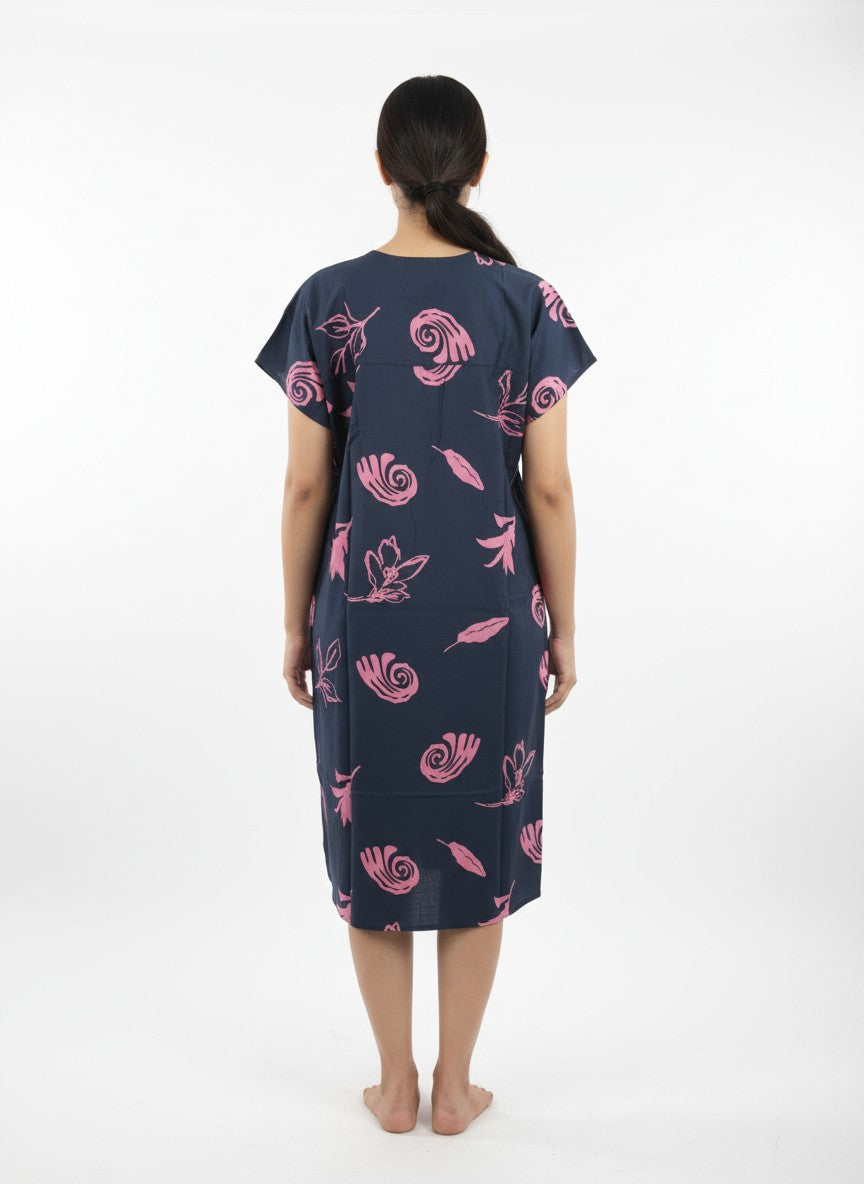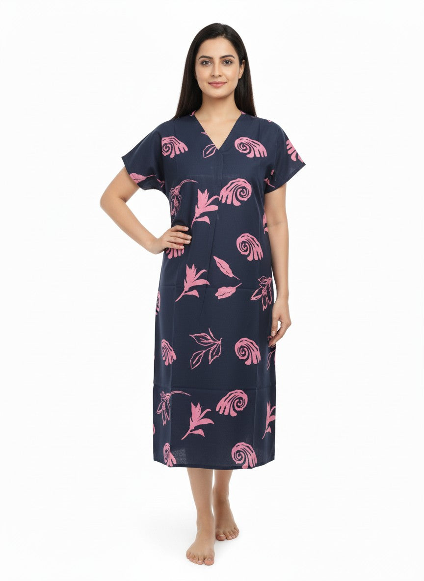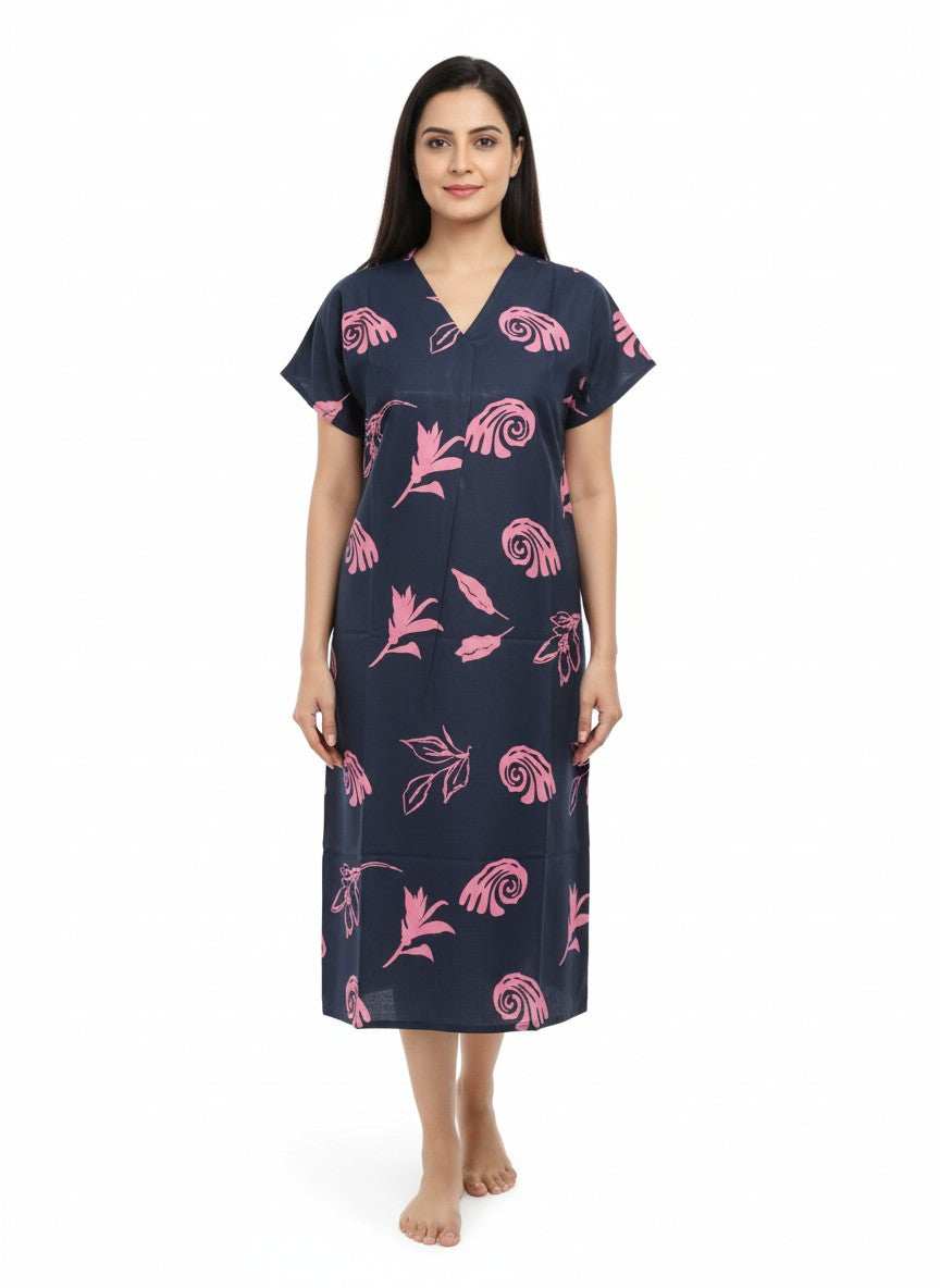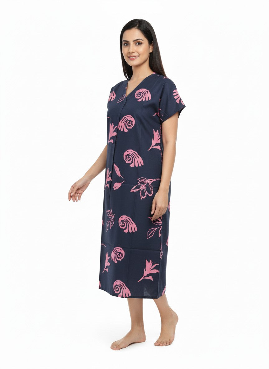 Experience soft and dreamy comfort with this loose fit short nightie, featuring half sleeves, a V-neckline, and a pullover closure that enhance ease and relaxation. The floral pattern adds a touch of charm, while the imported rayon fabric ensures breathability, lightweight feel, and stretchability suitable for all seasons. Easy to care for with machine wash cold instructions, this nightdresse is perfect for lounging and peaceful sleep every night.