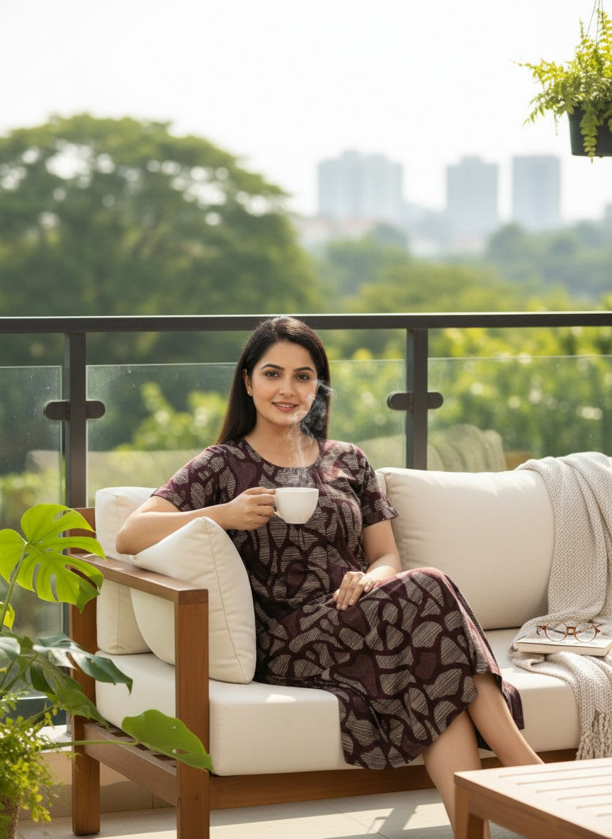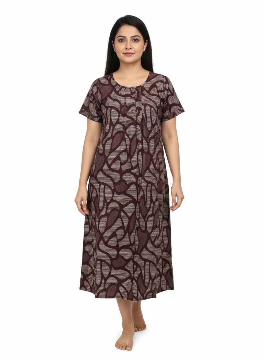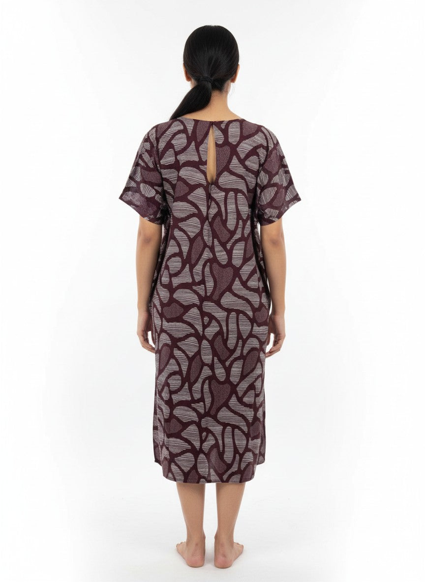Experience soft and dreamy comfort in this loose fit short nightie, perfect for all seasons' lounging and restful nights. It features a round neck, half sleeves, and a pullover style with an abstract pattern that adds a touch of elegance. Crafted from imported rayon, the lightweight and stretchable fabric ensures breathability and ease of movement. Easy to care for with machine wash cold instructions, this nightie is ideal for everyday comfort and relaxation.