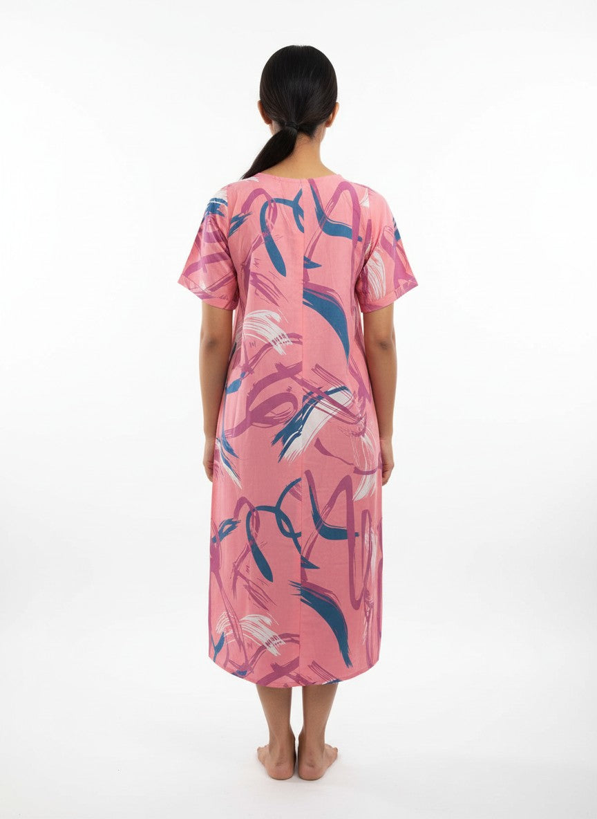Experience serene comfort with this soft and dreamy nightdress designed for all seasons. The loose fit silhouette features half sleeves and a round neckline with pullover closure, adorned in an abstract pattern that adds subtle elegance. Crafted from lightweight imported rayon, this breathable and stretchable fabric ensures ease of movement and gentle wear throughout your night. Easy to care for with machine wash cold, this nightdress is perfect for lounging and peaceful sleep.