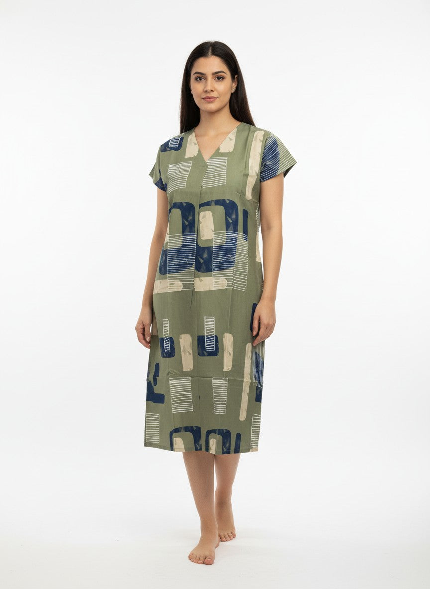 Experience soft and dreamy comfort with this loose fit short nightie designed for all seasons. Featuring half sleeves, a V-neckline, and a pullover closure, it showcases an abstract pattern that adds subtle style to your loungewear. Crafted from imported viscose fabric, it is lightweight, breathable, and stretchable, ensuring ease of movement and cozy wear. Easy to care for with machine wash cold instructions, this nightie is perfect for lounging and restful sleep.