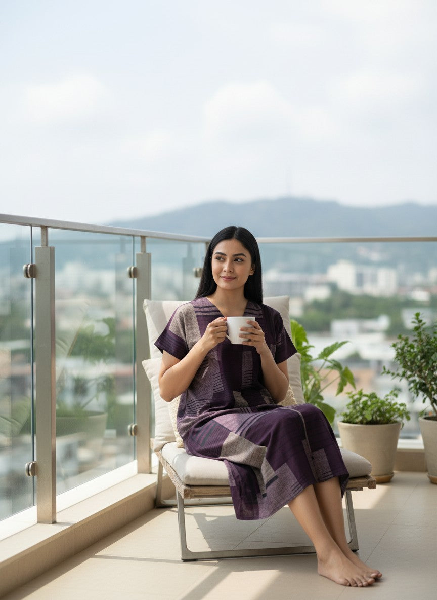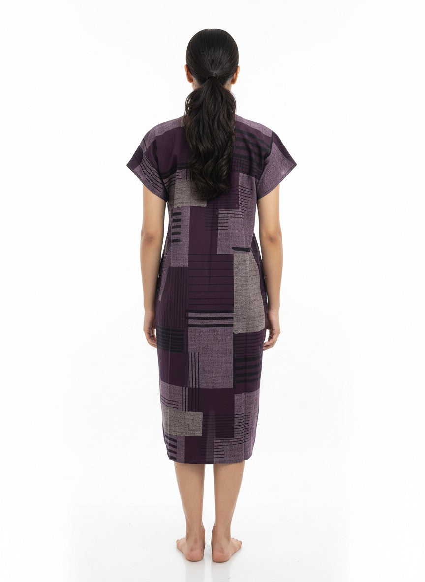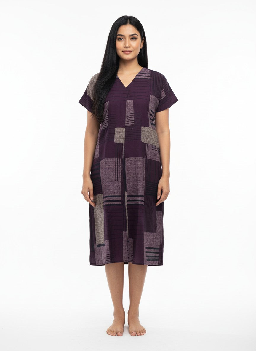 Experience the soft and dreamy comfort of this loose fit short nightie, designed for all seasons and perfect for lounging or restful sleep. Featuring a V-neck, half sleeves, and a pullover closure, it showcases an abstract pattern crafted from imported viscose fabric that is lightweight, breathable, and stretchable. This nightie is easy to care for with machine wash cold instructions, making it an ideal choice for everyday comfort.