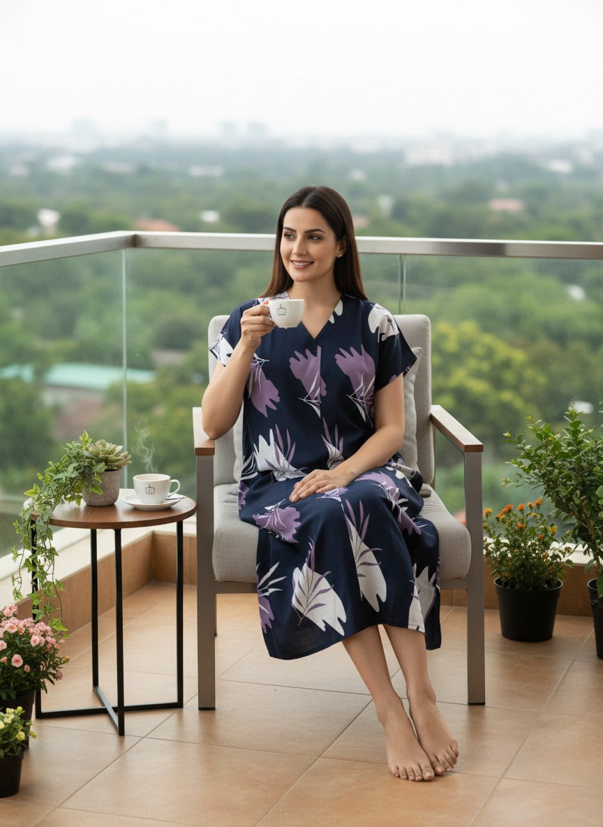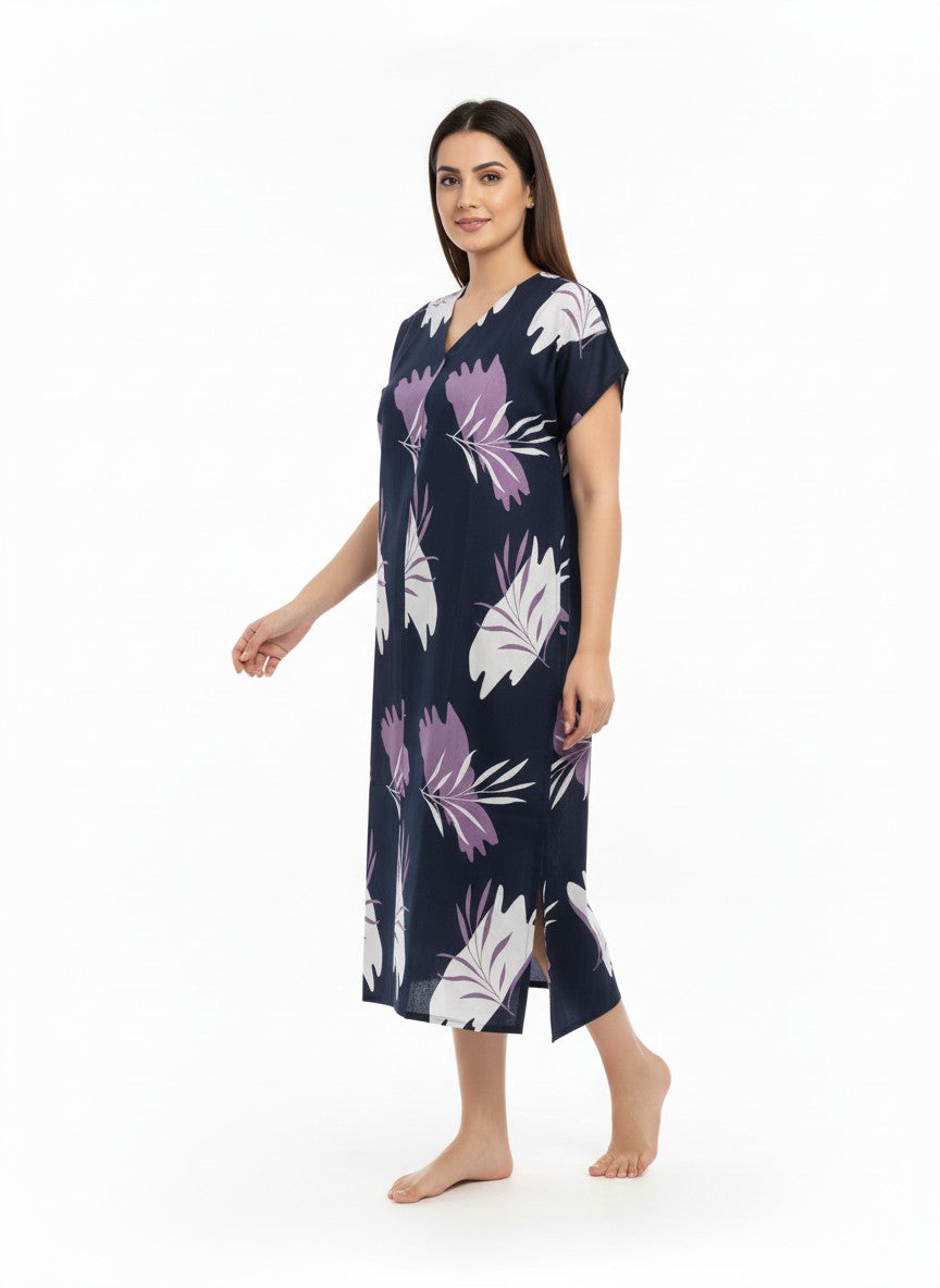 Experience soft and dreamy comfort with this loose fit nightdress, featuring half sleeves, a V-neckline, and a pullover closure adorned with a delicate floral pattern. Made from lightweight imported rayon, this nightdress offers breathability and stretchability, perfect for all seasons. Easy to care for with machine wash cold instructions, it is ideal for lounging, sleeping, and everyday comfort.