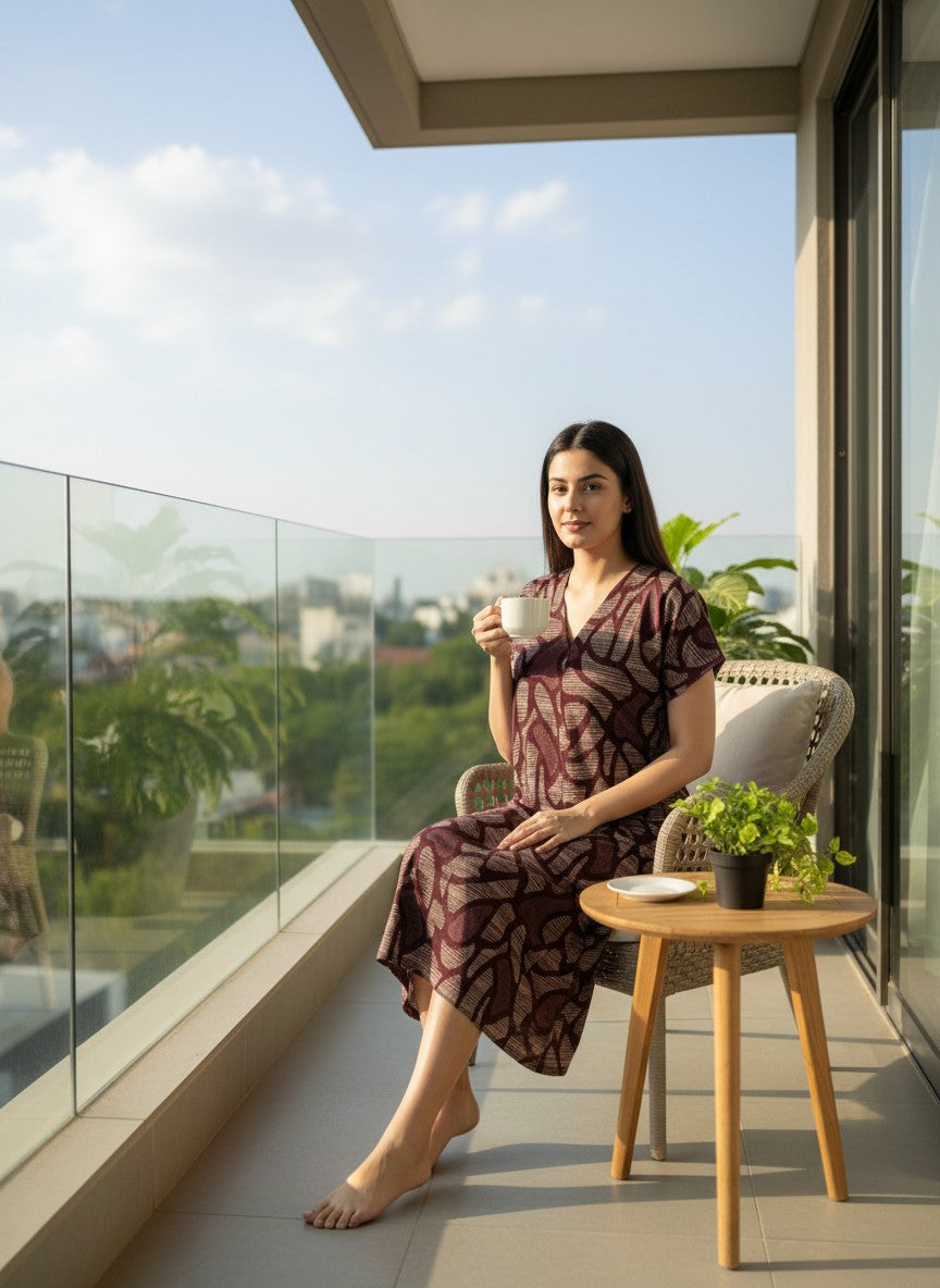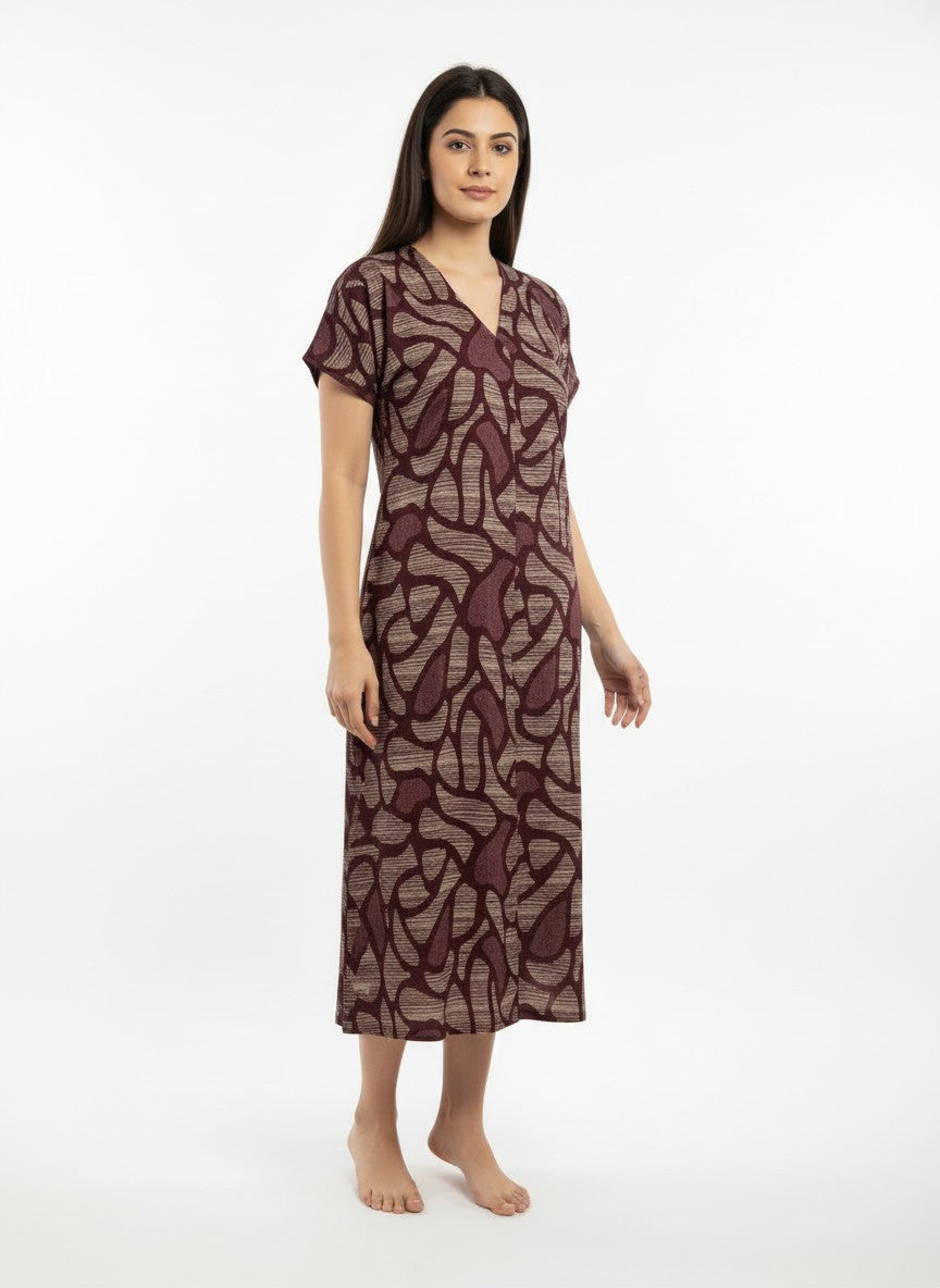 Experience soft and dreamy comfort with this maroon short nightie designed for all seasons. Featuring a loose fit silhouette with half sleeves, a V-neckline, and convenient pullover closure, its abstract pattern enhances the gentle vibe. Crafted from imported rayon, this lightweight and stretchable fabric promises breathability and ease of movement. Machine washable for effortless care, it is perfect for lounging and restful nights.