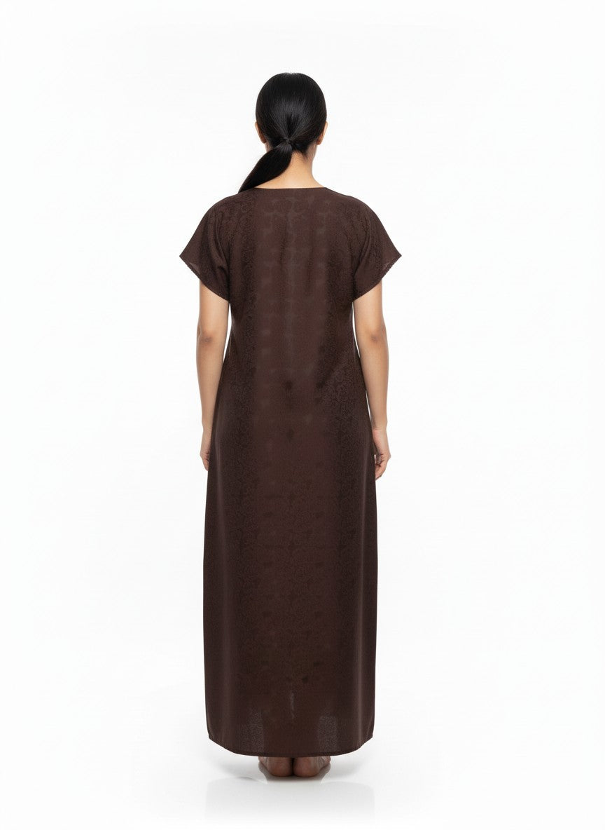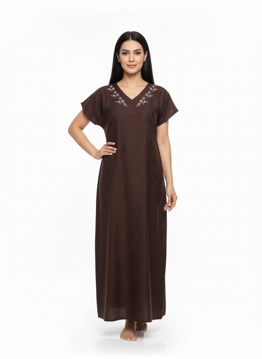 Experience soft and dreamy comfort with this Velvet nighty, designed for all-season wear and ideal for lounging or restful sleep. The A-line silhouette features half sleeves, a V-neckline, and a pullover closure, enhanced by elegant embroidery. Crafted from lightweight satin fabric, it offers breathability without stretch, ensuring comfort and ease. Easy to care for with machine wash cold, this nighty combines style and practical comfort for everyday relaxation.