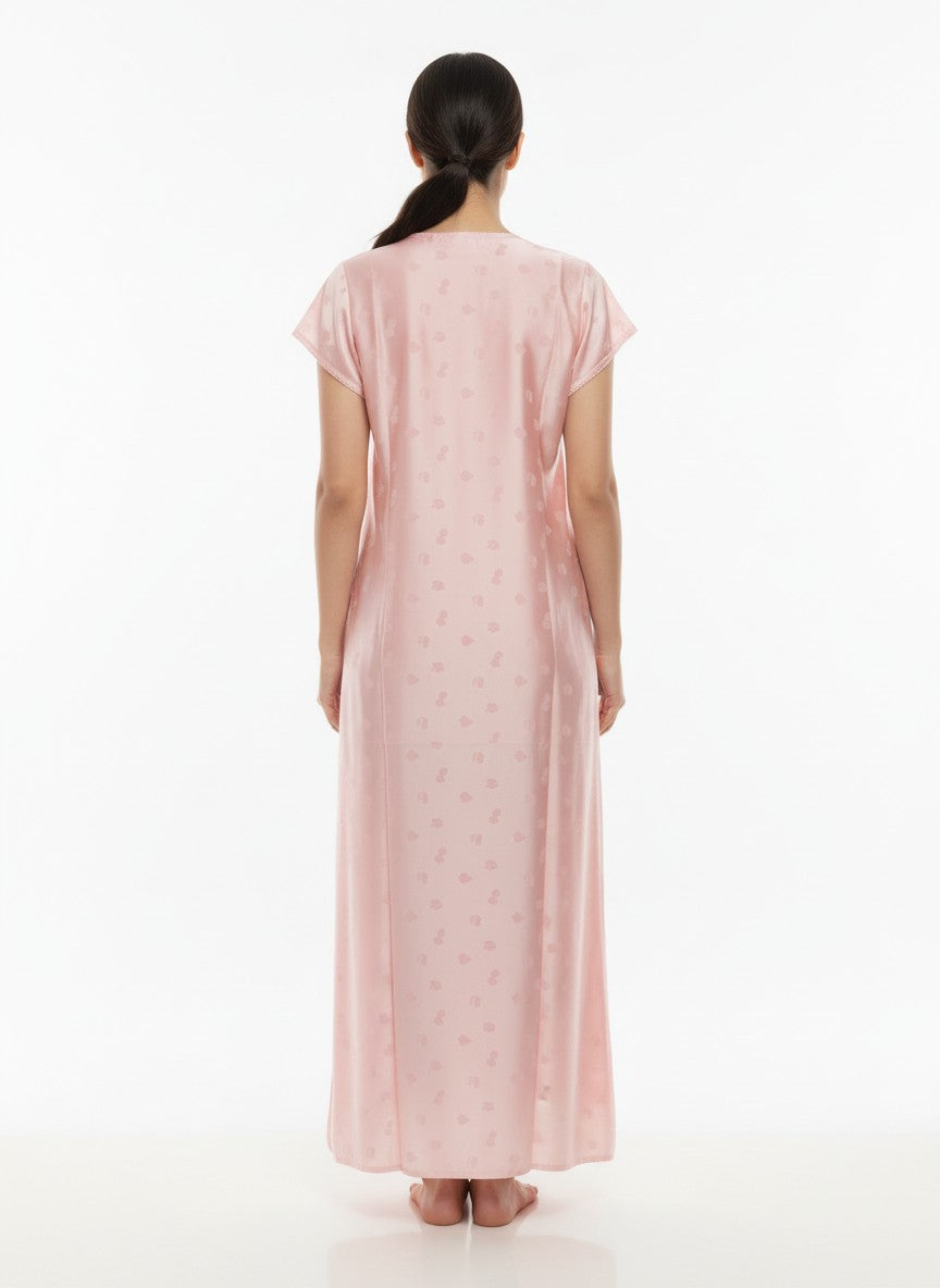 Experience everyday comfort with this soft and lightweight nighty designed for all seasons. The regular fit silhouette features short sleeves, a V-neckline, and a pullover closure adorned with elegant embroidery. Made from satinbrasso fabric, it offers a breathable and non-stretchable feel perfect for lounging or sleep. Easy to care for with machine wash cold instructions, this nighty combines style and comfort seamlessly.