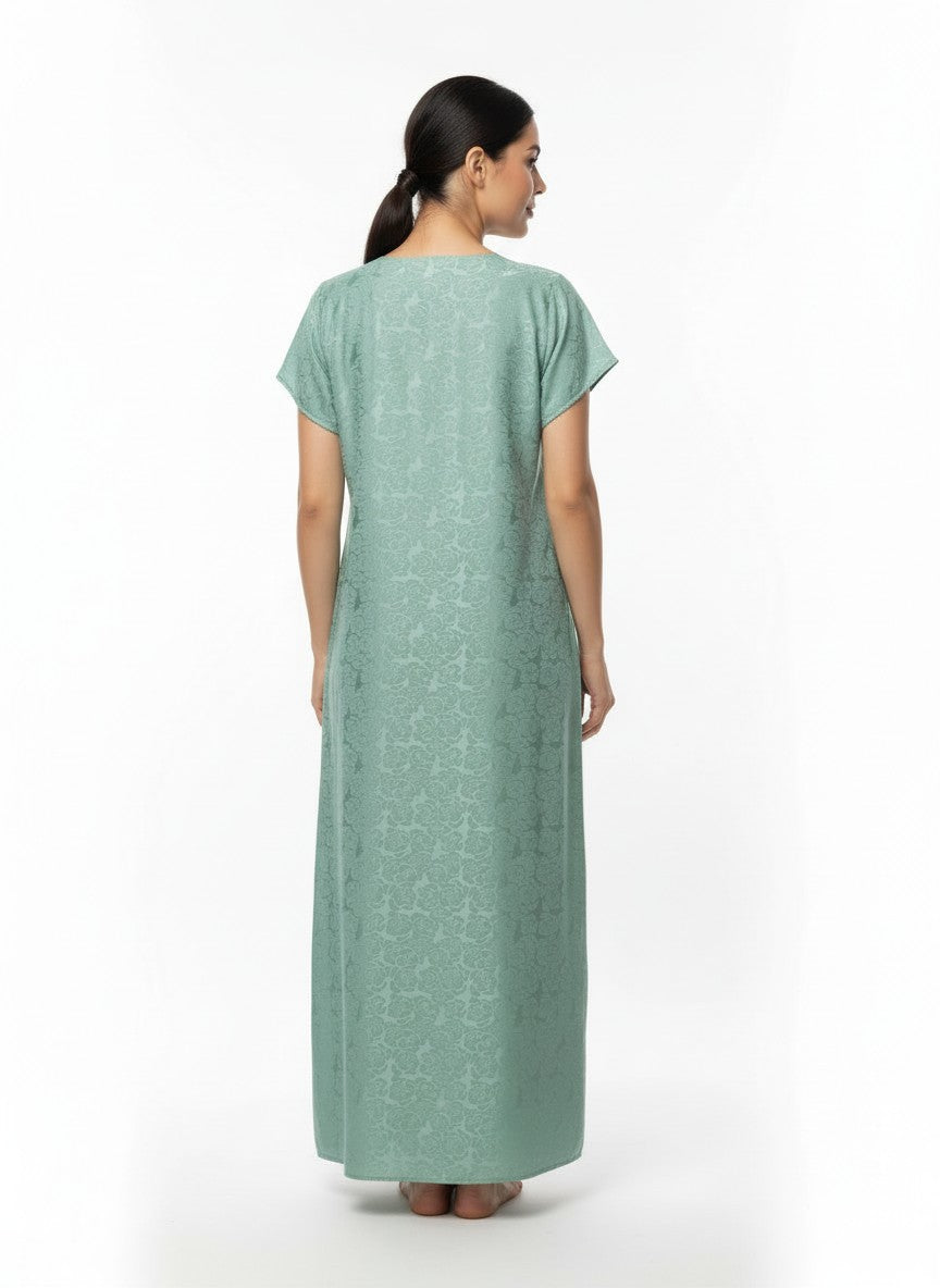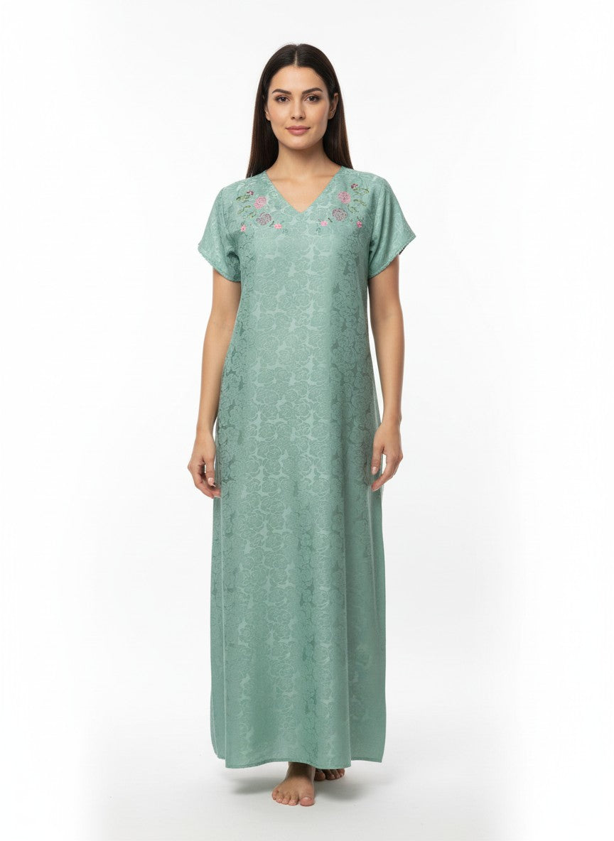 Experience ultimate emotional comfort with this velvet nighty, designed for everyday lounging and sleep. Its A-line silhouette offers a relaxed regular fit, complemented by half sleeves, a flattering V-neckline, and an easy slip-on closure featuring intricate embroidery for added style. Crafted from lightweight satinbrasso fabric, it promises breathability, stretchability, and suitability for all seasons. Easy to care for with machine wash cold instructions, this nighty combines softness, elegance, and practicality for your comfort and convenience.